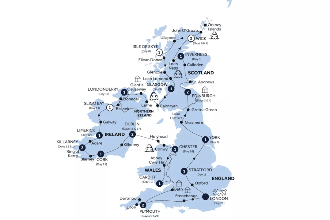 Your discovery of Britain and Ireland concludes upon your return to the hotel in London.
